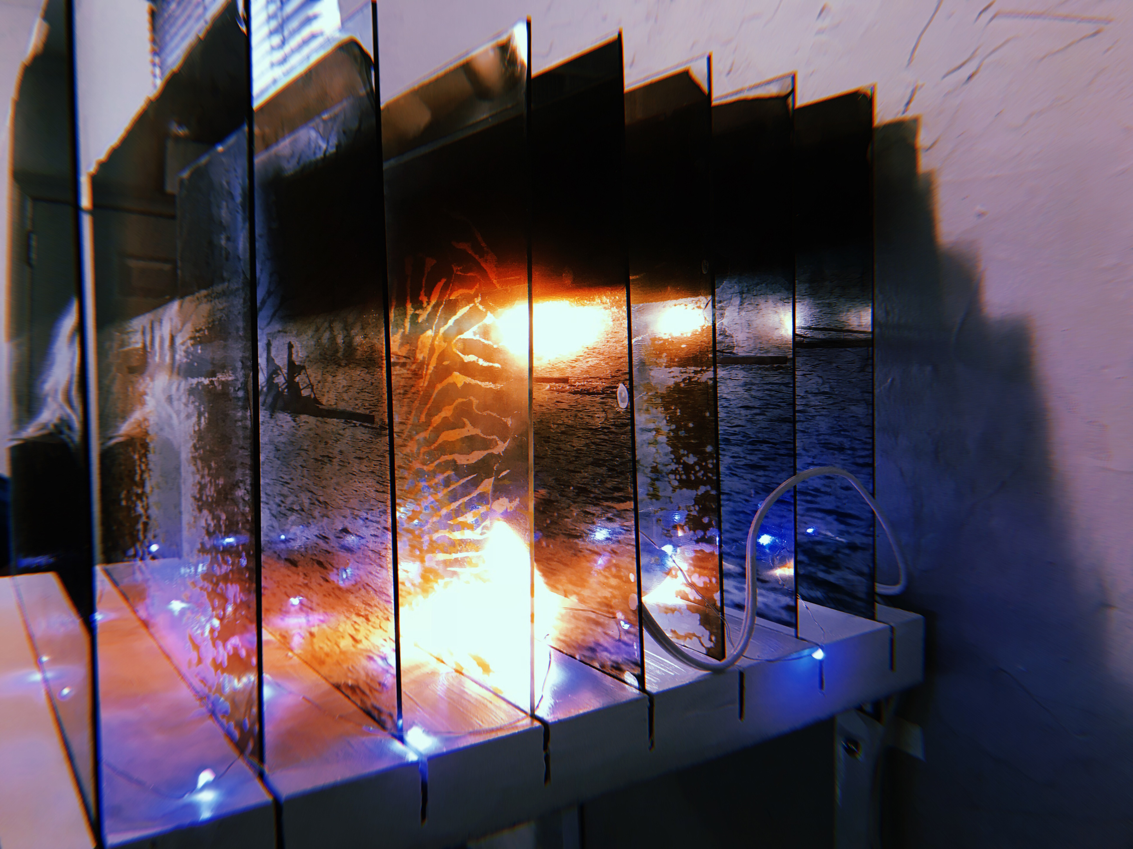 I took photos of rowers on Kelly Drive in Philly while the sun was going down. I snapped shots of them moving quickly, and then transferred the prints onto the glass.