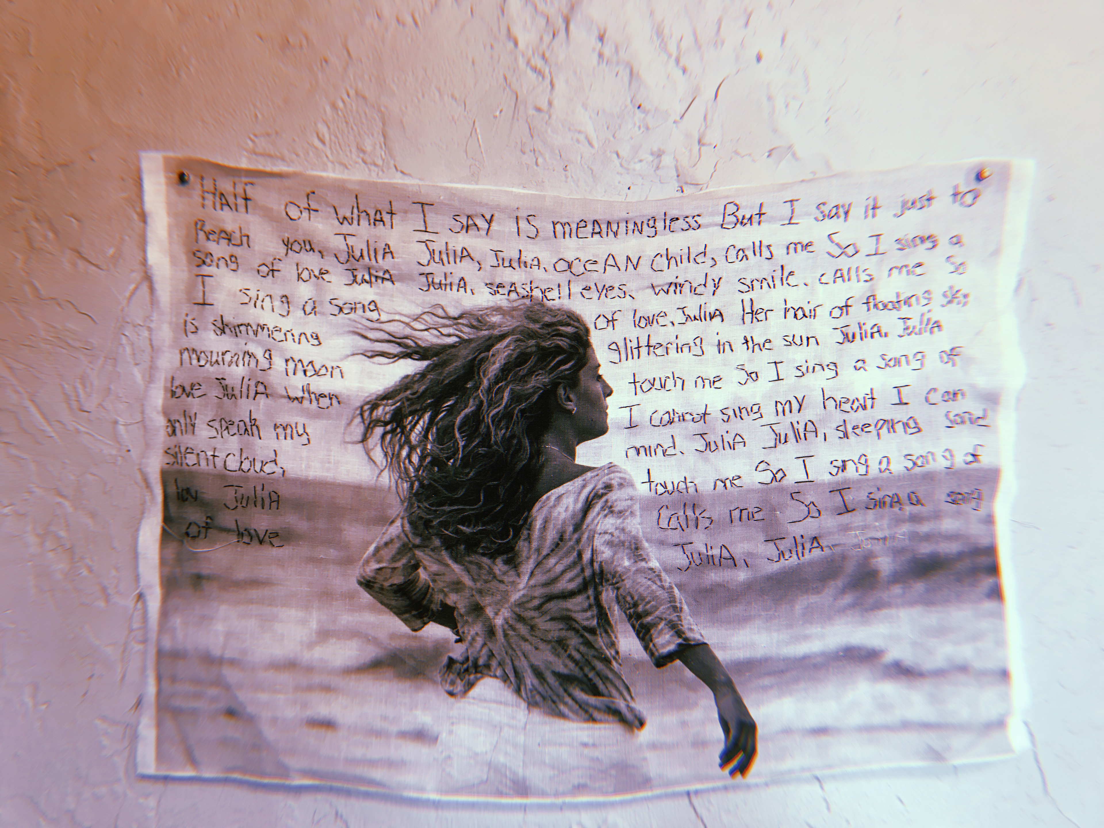I was named after The Beatles song "Julia." I hand sew the lyrics to the song. This piece is printed on fabric, and is a self portrait of myself.